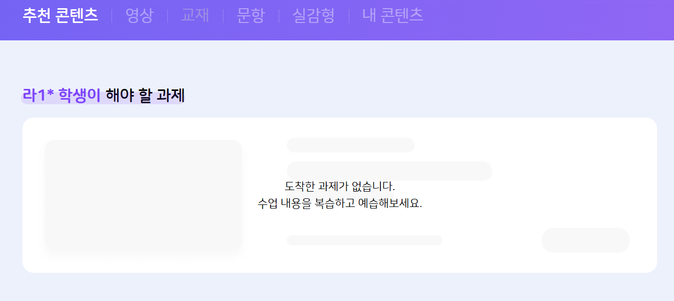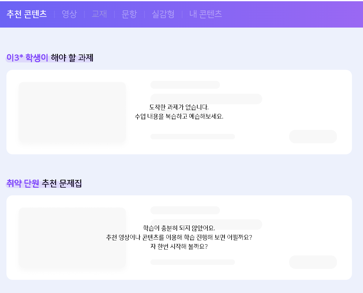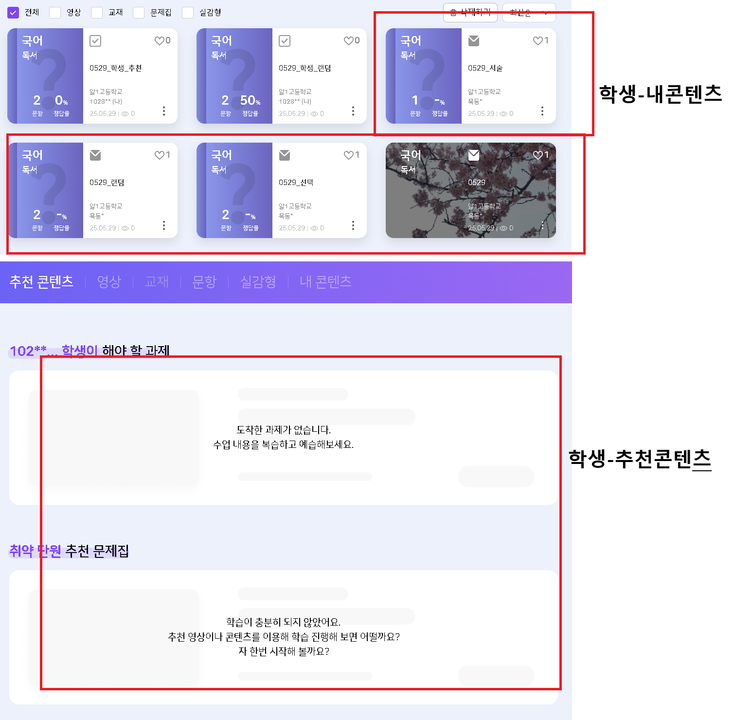 | Description | 교사가 배포한 영상,교재,문항이 학생 추천 콘텐츠에 노출되지 않는 현상 학생 내 콘텐츠에서는 교사가 배포한 영상,교재,문항이 노출되지만 추천 콘텐츠에서는 노출되지 않는 현상입니다. | ||||