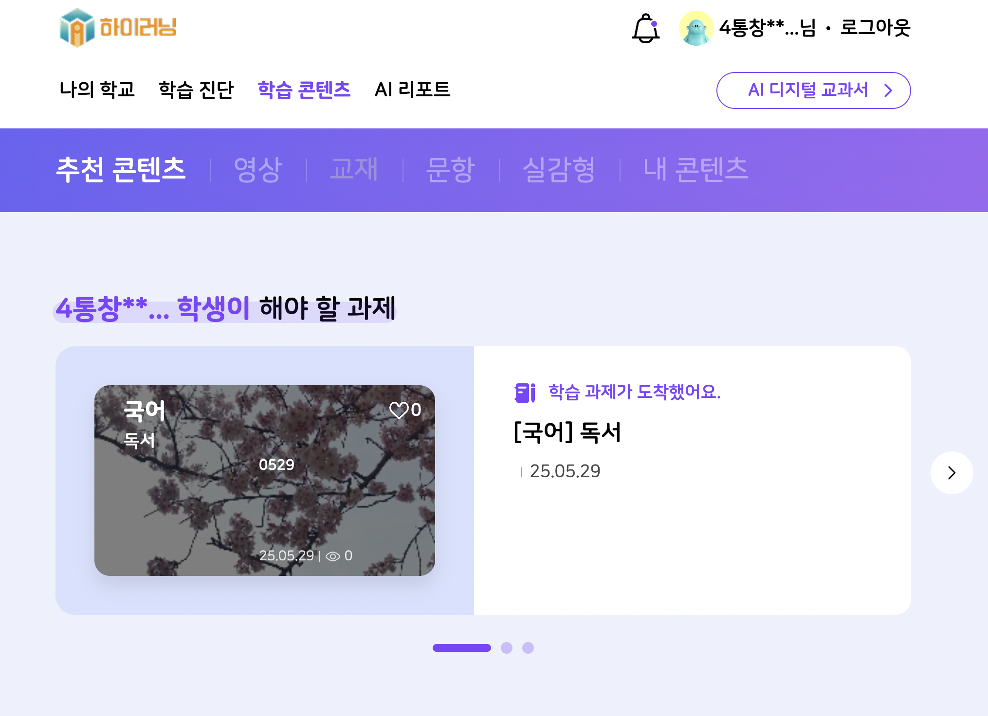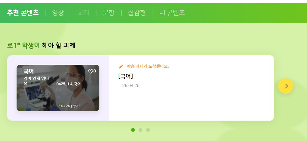 알1고등학교 2학년 1반 학생계정으로 로그인 후에 추천콘텐츠 확인결과 컨텐츠 조회 되는걸로 보입니다. 더 자세한 재현경로 알려주시면 확인해보겠습니다. |
