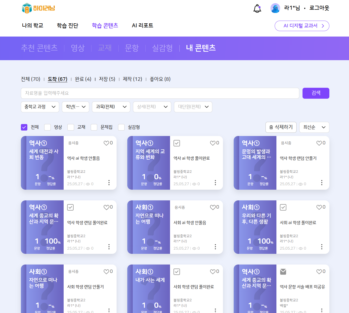 이슈 재현됩니다 상용 교사 : bck2024 상용 학생 : 블링중학교2 1-1-1 학생 내 콘텐츠 : 노출 학생 추천 콘텐츠 > 해야 할 과제 : 미노출 |