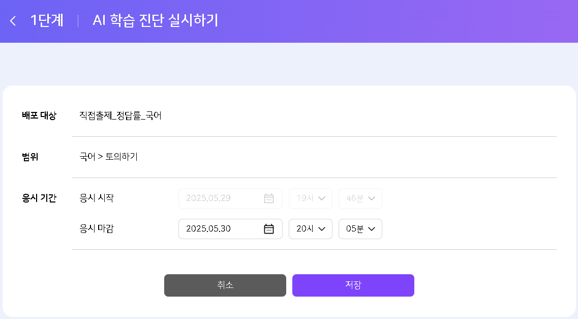 | Description | AI 학습진단 - 기간수정 : 마감 날자 현재시간 기준 24시간 이전인데 수정되는 현상 마감날자 변경은 "현재 시간" 기준 24시간 이후로 변경 가능해야함. | ||||