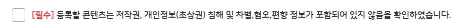 | Description | 학습 콘텐츠에 등록한 영상을 수정시 문구 누락 기대결과 : 등록할 콘텐츠는 저작권, 개인정보(초상권) 침해 및 차별,혐오,편향 정보가 포함되어 있지 않음을 확인하였습니다. ※입력한 내용으로 인해 발생하는 모든 책임은 등록자에게 있습니다. 현재 배포된 상용 : 등록할 콘텐츠는 저작권, 개인정보(초상권) 침해 및 차별,혐오,편향 정보가 포함되어 있지 않음을 확인하였습니다. | ||||