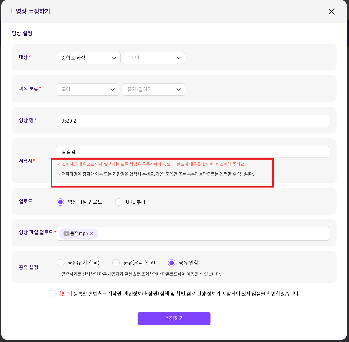 초등/중등/고등 영상 수정 페이지 내용 추가합니다. 저작자 안내 텍스트 색상 수정 필요. 초등 : 두 줄 다 주황 중등/고등 : 두 줄 다 검정 |