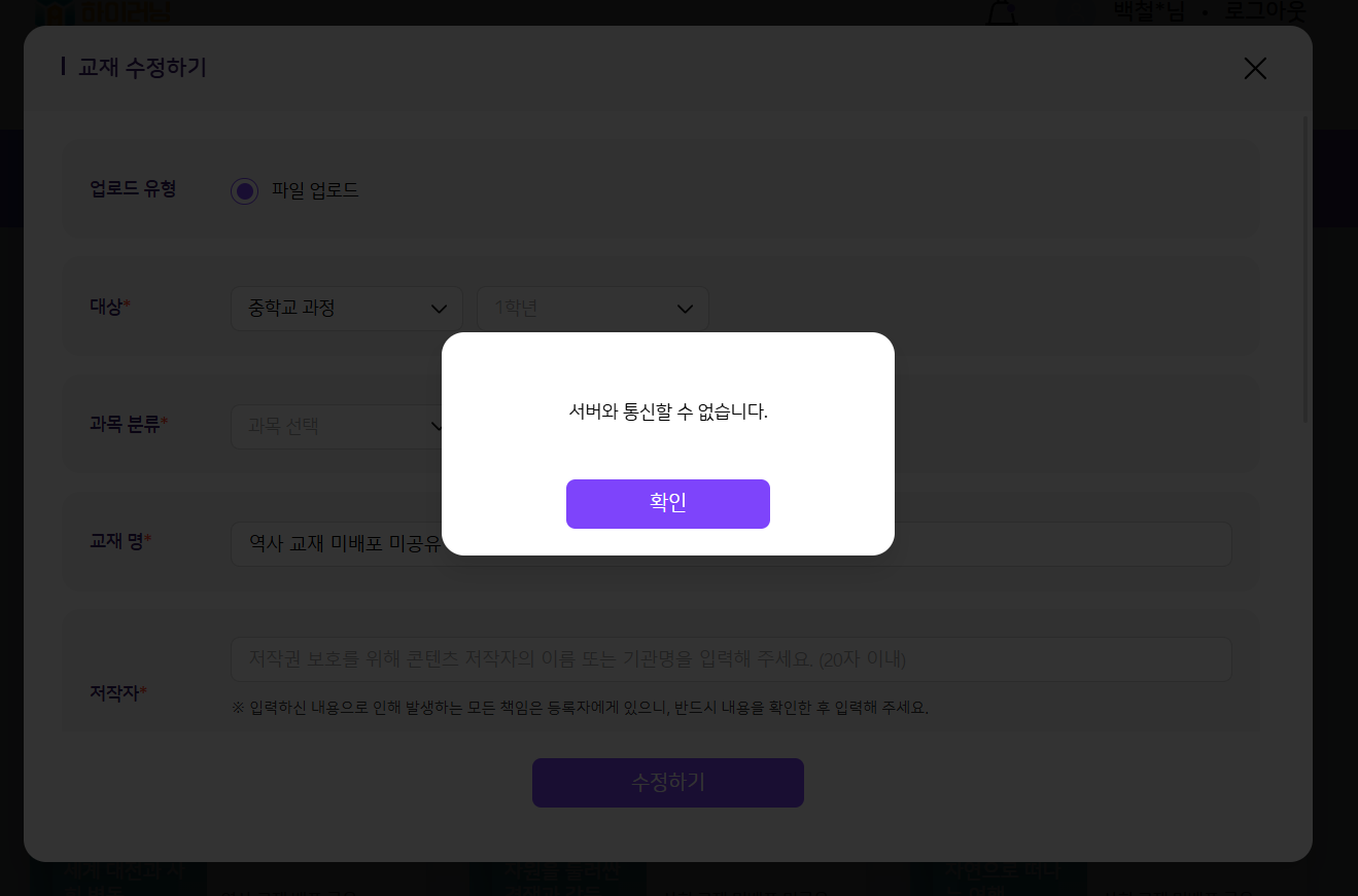 | Description | (중1역사사회) 구분류체계에서 생성한 교재를 분류체계 변경 후에 수정 시 "서버와 통신할 수 없습니다." 팝업 노출 기대결과 : "서버와 통신할 수 없습니다." 팝업 노출되면 안됨 | ||||
