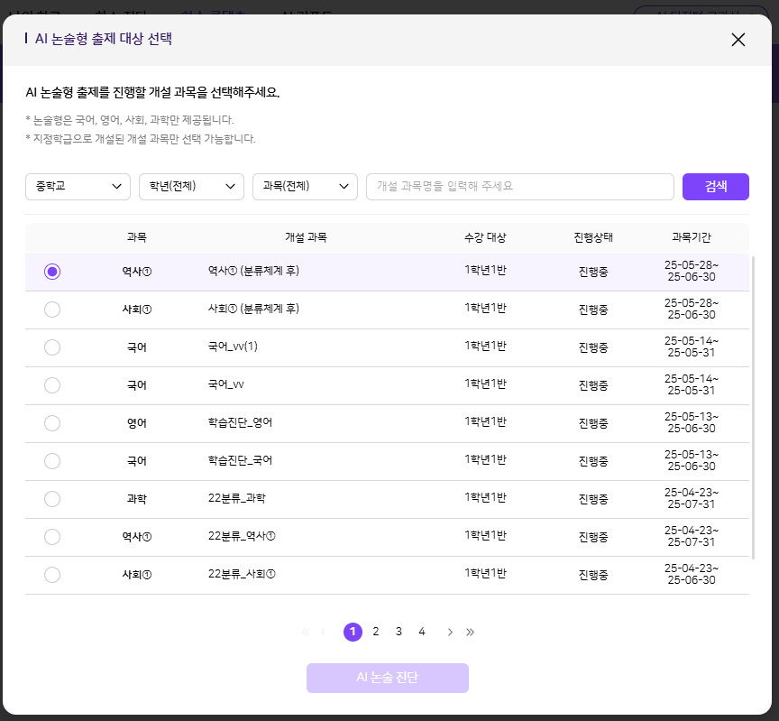 | Description | 문항 > 논술진단 중1 역사1 과목 선택 시 [AI 논술 진단] 버튼이 활성화되지 않는 현상 | ||||