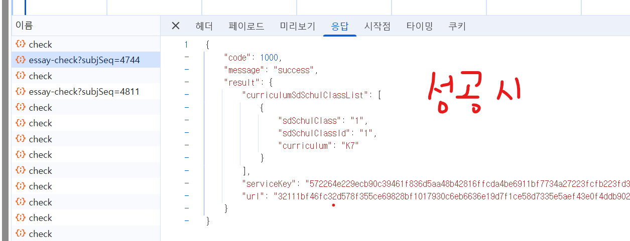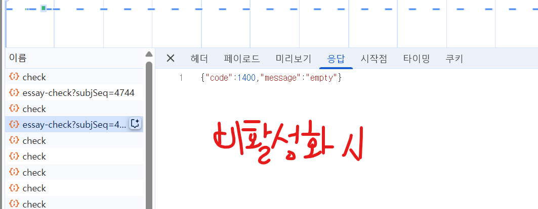 아래 두가지 케이스가 되는 분류체계 선택시를 비교했을 때 네트워크탭입니다. 1. AI 논술진단 버튼 활성화 2. AI 논술진단 버튼 비활성화 ECP쪽에서는 두가지 케이스에서의 별도 API 에러 RESPONSE를 확인하지 못했습니다. |