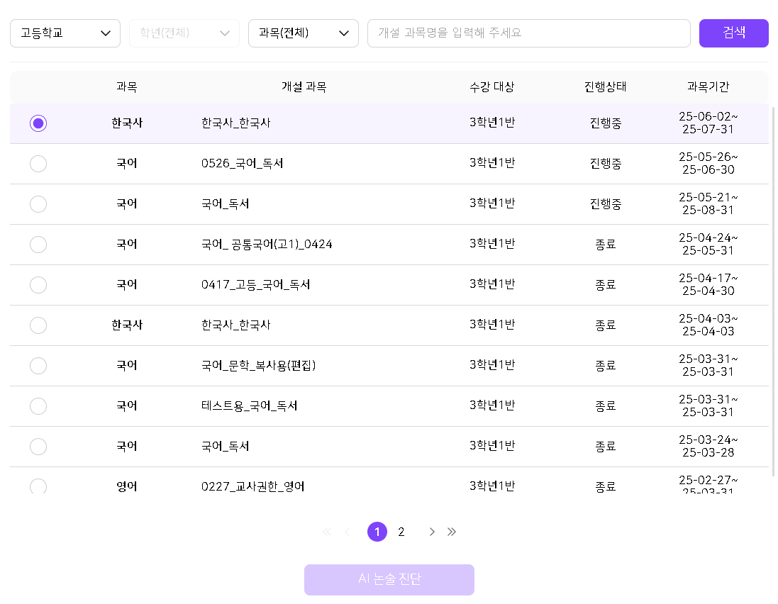 TB 서버. 고등학교 : 1. 사회 탐구 과목 [AI 논술진단] 버튼 활성화 2. 한국사 과목 [AI 논술진단] 버튼 비 활성화 |