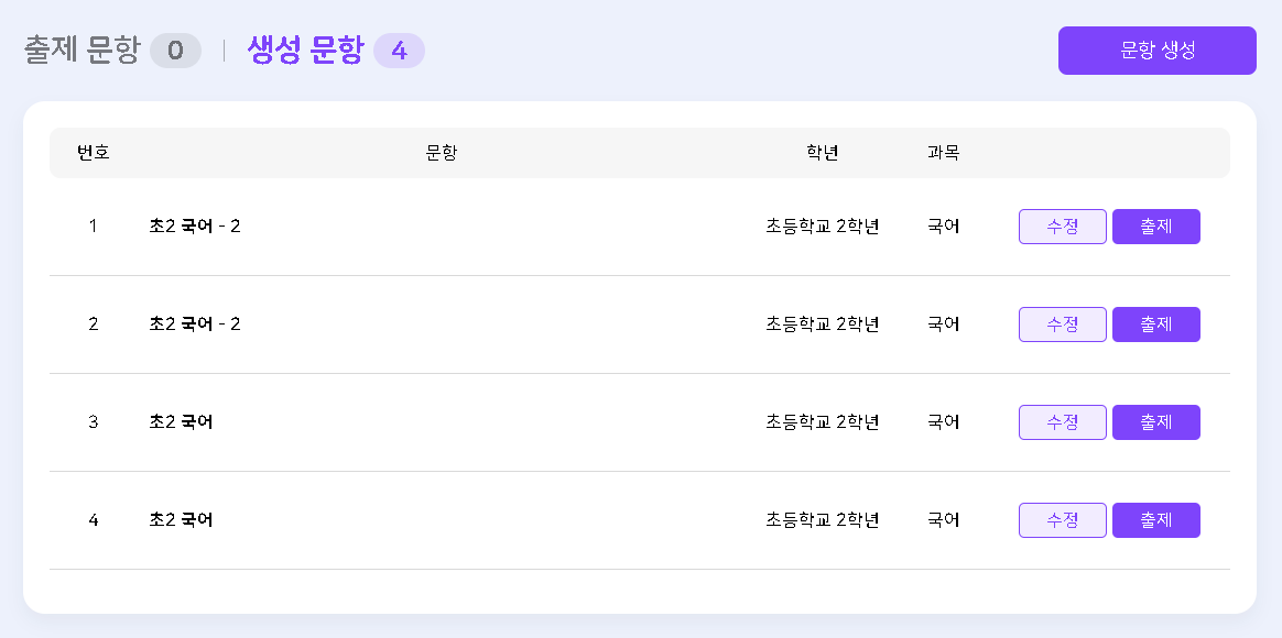 | Steps To Reproduce | 1. 학습 콘텐츠 > 문항 > 등록하기 > AI 논술형 출제하기 > "초2_15_국어" 선택 2. 생성 문항 클릭 > 문항 생성 클릭 > 내용 기입 후 [생성하기] 클릭 3. 생성된 문항 리스트 확인 | ||||