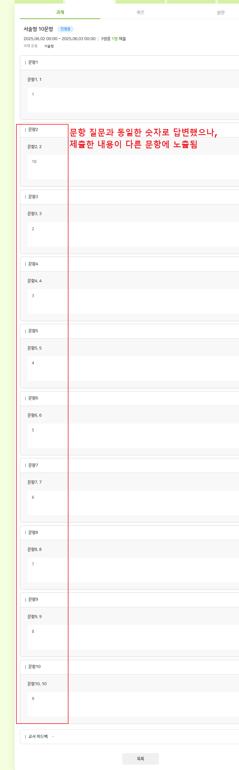 | Description | 교사가 수업 과제로 '배점 없음', 10문항 이상 생성할 경우, 학생이 제출한 내용이 다른 문항에 잘못 출력되는 현상입니다. - ex. 학생이 2번 문항에 "2"로 작성 했으나, 교사가 확인 할 때 3번 문항에 "2"가 출력됨 ※ 과제 형식(서술형, 파일 첨부형) 설정에 관계 없이 발생됩니다. - ex. 서술형만 10개 생성해도 발생 | ||||