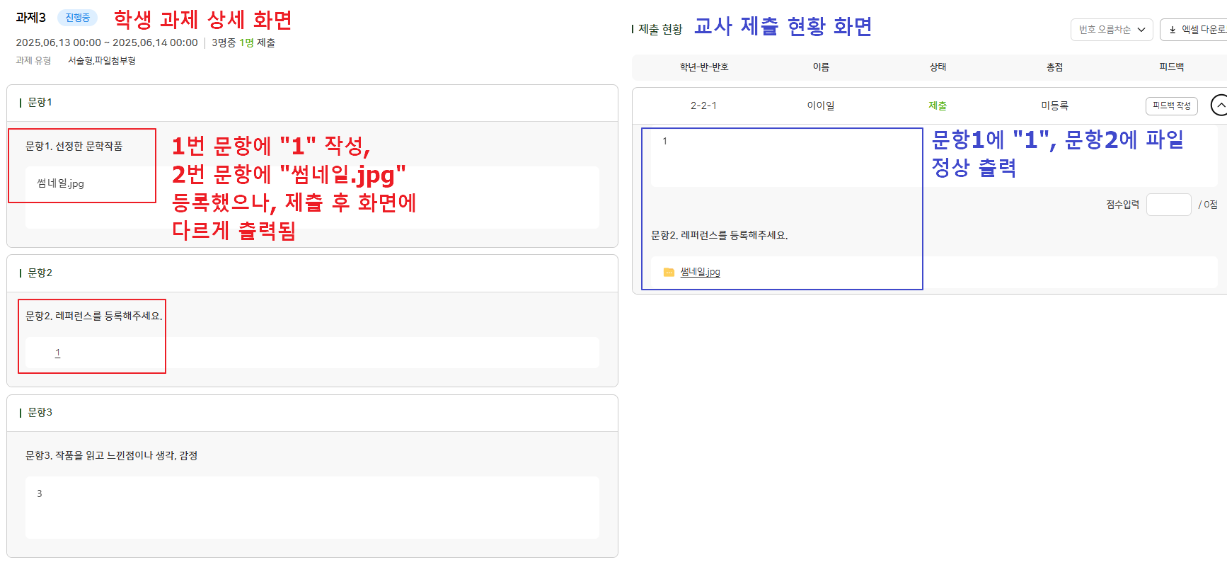 | Steps To Reproduce | 1. 상용 > j2002 로그인 2. 2학년 2반 > 나의 수업 진입 3. "미술_테스트" 수업 카드 클릭 4. 수업 활동 탭 > [등록] 버튼 클릭 5. 서술형 10문항, 배점 없음 설정 후 등록 진행 6. 학생 > 제이디자인초등학교 2학년 2반 1번 로그인 7. 나의 수업 > "미술_테스트" 수업 카드 클릭 8. 수업 활동 탭 > 생성된 과제 제출 9. 교사(j2002) 화면에서 제출된 과제 확인 | ||||