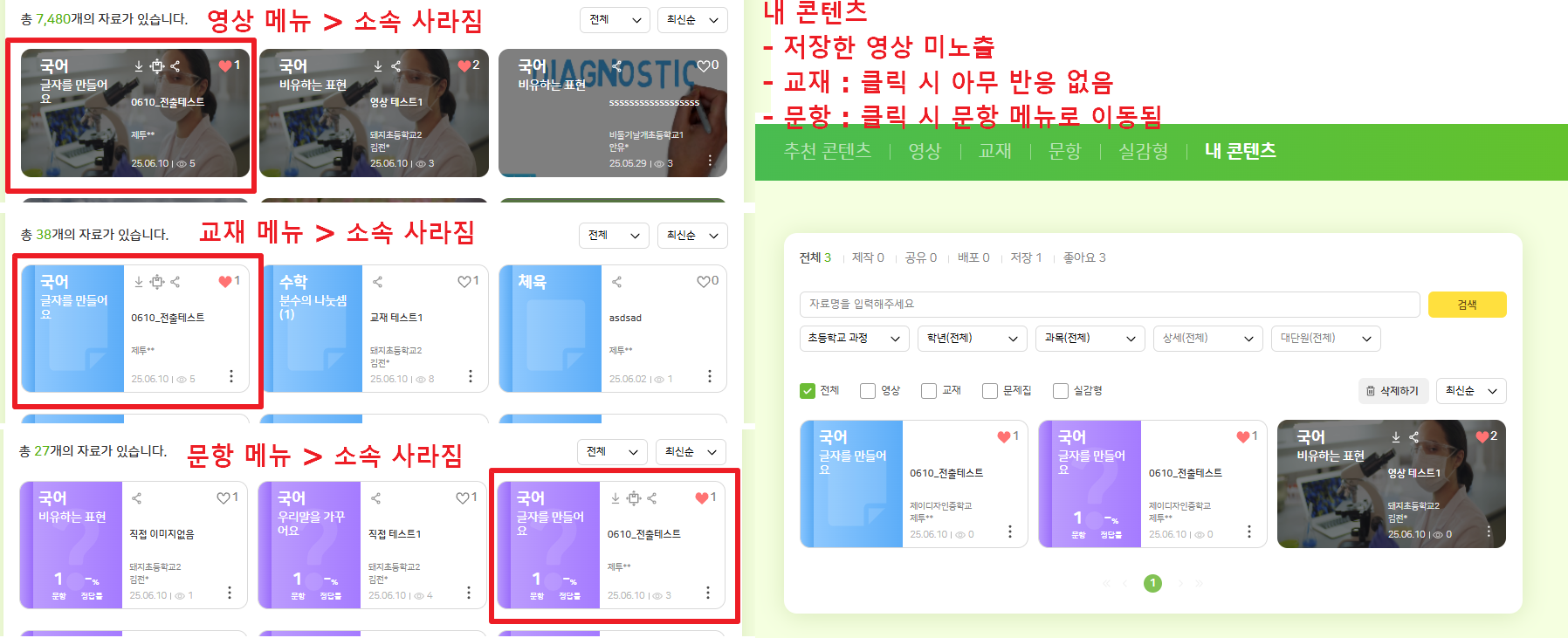 | Description | '우리 학교'로 자료 공유한 교사가 다른 학교로 전출 갈 경우 공유 받은 자료가 비정상 동작하는 현상입니다. 1. 영상 : 내 콘텐츠에서 사라짐 / 영상 메뉴에는 학교 소속이 사라짐 2. 교재 : 내 콘텐츠에 있으나 클릭 시 뷰어 실행 안됨 / 교재 메뉴에는 학교 소속 사라짐 3. 문항 : 내 콘텐츠에 있으나, 클릭 시 문항 메뉴로 이동 / 문항 메뉴에는 학교 소속 사라짐 | ||||