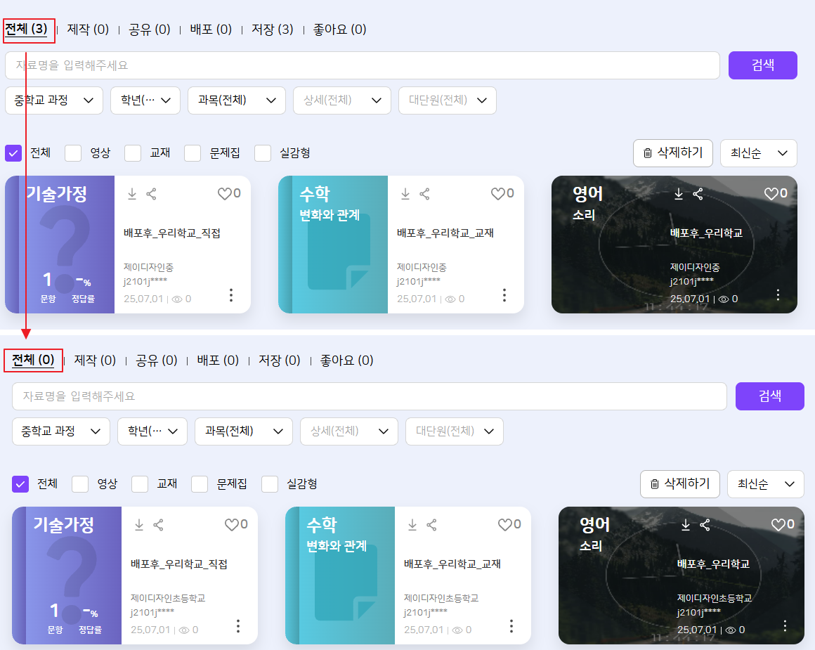 상용에서 교사 전출 시 공유받은 자료가 노출됨을 확인했습니다. 다만, 콘텐츠 수량이 0으로 출력되고 있어 확인 부탁드립니다. |