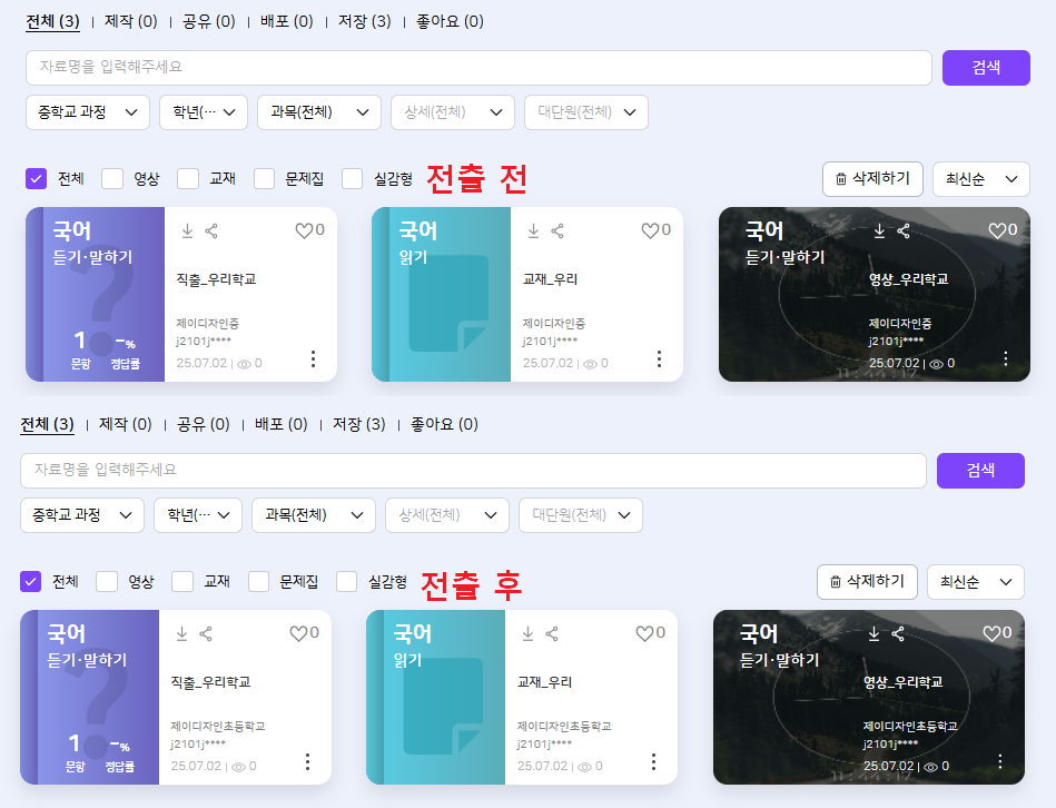 | Steps To Reproduce | ※ 예시 : 교사 A, 교사 B 1. A : 콘텐츠 생성 및 '우리학교' 공유 2. B : A가 만든 자료 저장, 좋아요, 수업자료 사용 3. A가 다른 학교로 전출 4. B : 학습 콘텐츠 내 각 메뉴에서 A 자료 확인 | ||||