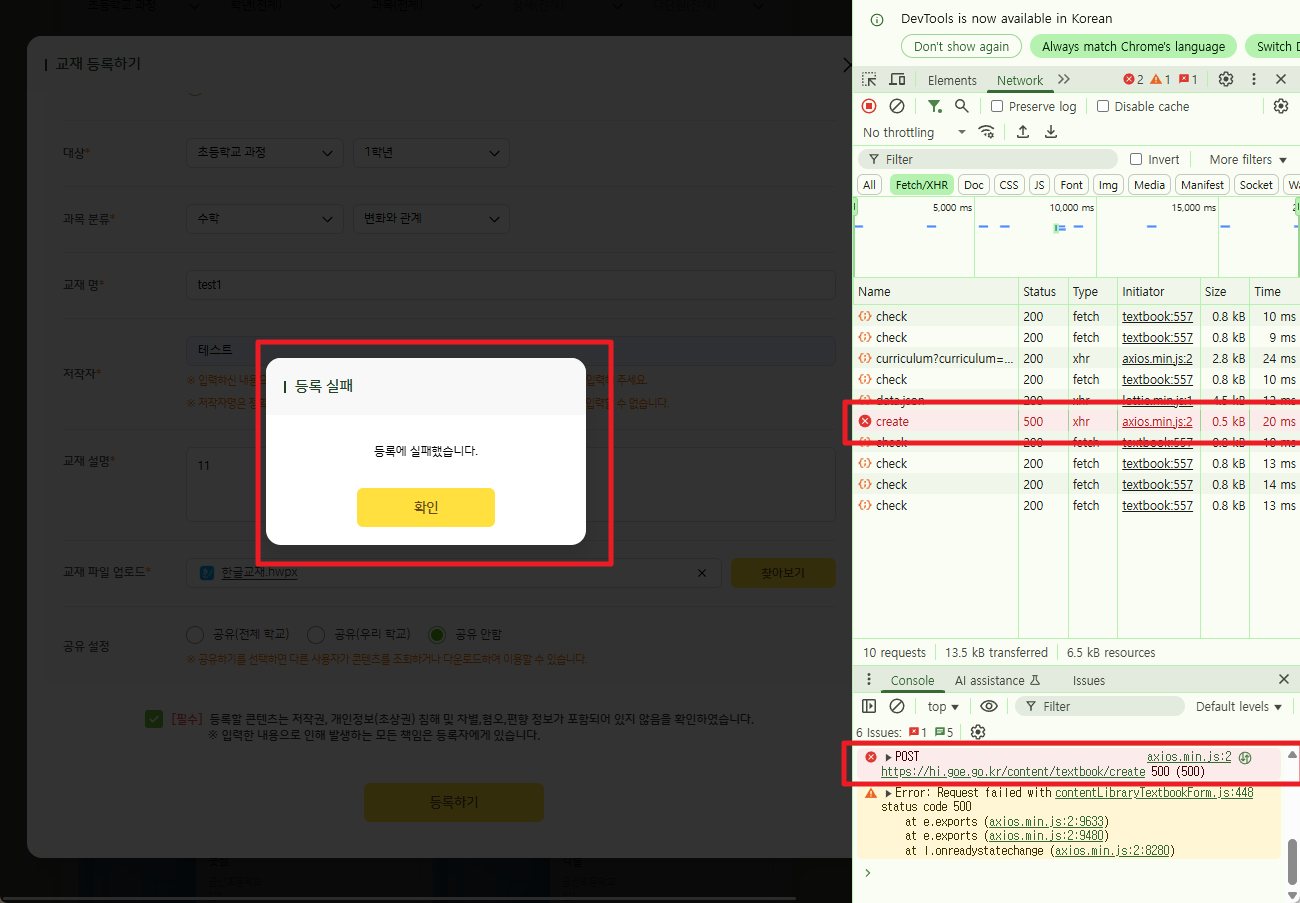 | Steps To Reproduce | 1. 교사 > 학습 콘텐츠 > 교재 진입 2. 화면 우측 상단 [등록하기] 버튼 클릭 3. 필수 항목 입력 및 hwpx 파일 업로드 4. 팝업 하단 [등록하기] 버튼 클릭 5. 에러 메시지 발생 확인 | ||||