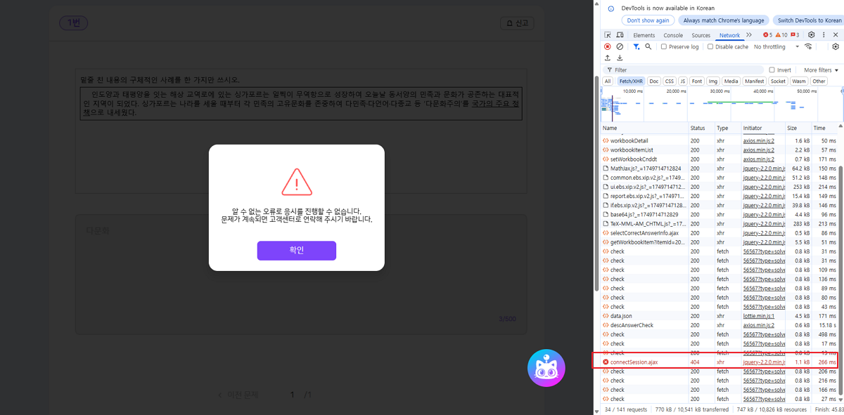 Description학생이 배포된 서술형 문제 답안 작성 후 제출 시 "알 수 없는 오류로 응시를 진행할 수 없습니다" 에러가 발생되는 현상입니다.