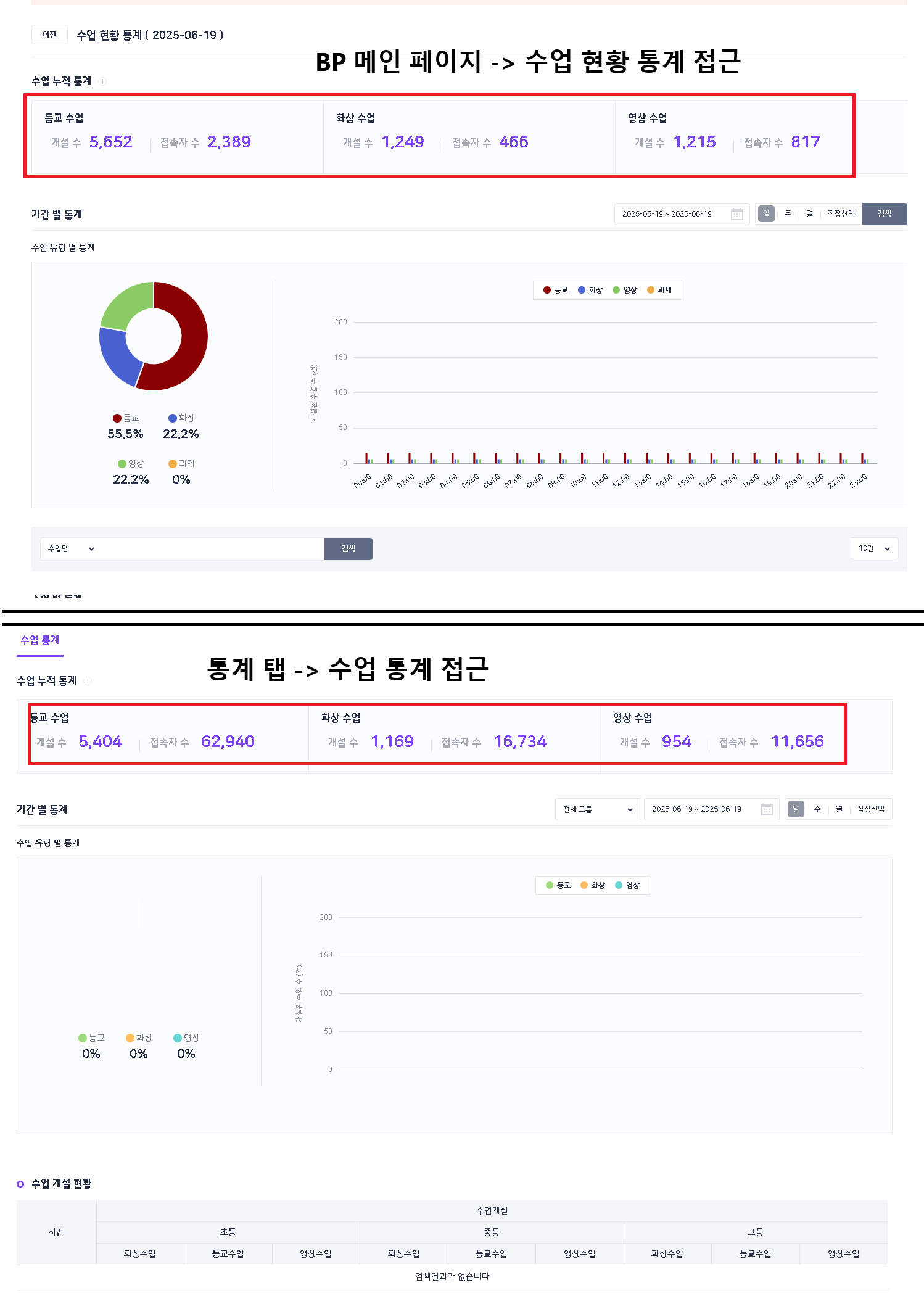 | Steps To Reproduce | 1. 메인 페이지 > 수업 현황 통계 더보기 클릭 > 노출 데이터 확인 2. 통계 탭 > 수업 통계 클릭 > 노출 데이터 확인 | ||||