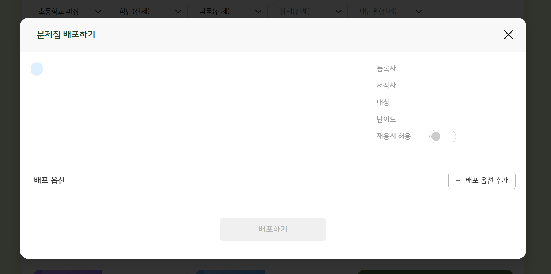 | Steps To Reproduce | 1. 교사 로그인 2. 학습 콘텐츠 > 문항 생성 > 배포 > '문제집 배포하기' 팝업 확인 | ||||