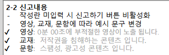 | Description | 신고 내용 작성란 placeholder 기획과 다름 기획 : 영상, 교재, 문항에 따라 예시 문구 변경 영상: 0분 00초에 부적절한 영상이 노출 됩니다. 교재: 저작권을 침해하는 콘텐츠 입니다. 문항: 스팸성, 광고성 콘텐츠 입니다. TB : 0분 00초에 부적절한 영상이 노출 됩니다. *문구가 영상/교재/문항에 따라 달라야 하는데 다 똑같음 | ||||