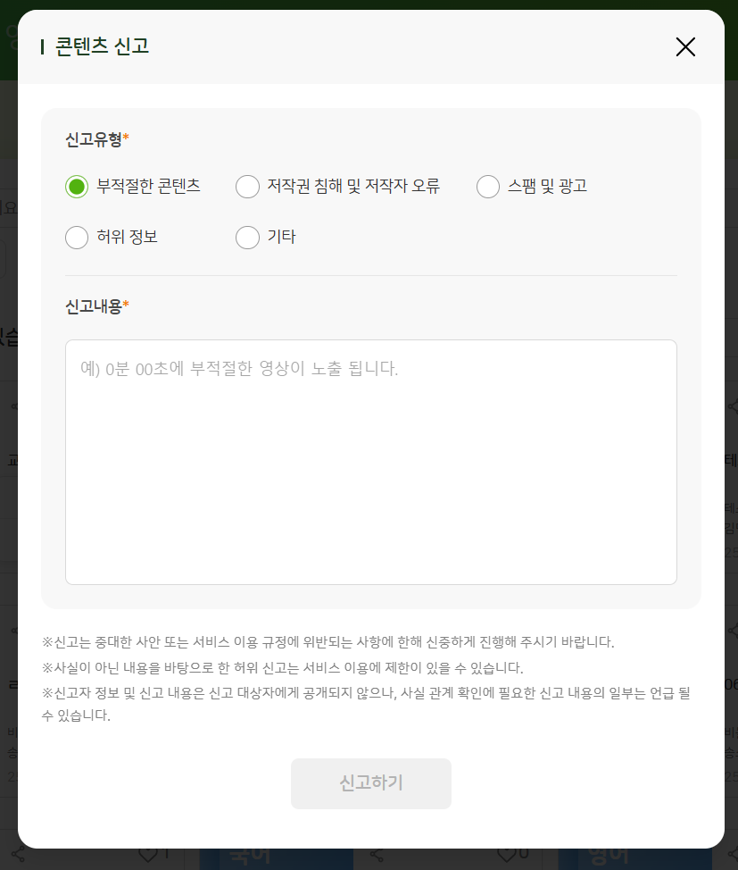 | Steps To Reproduce | 1. 교사 로그인 2. 영상/교재/문항 신고하기 > 신고내용 작성란 placeholder 확인 | ||||