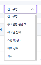 | Description | 콘텐츠 신고 접수에서 '신고유형' 드롭다운 중 '저작권 침해'가 '저작권 침해 및 저작자 오류'로 변경되어야 함 | ||||