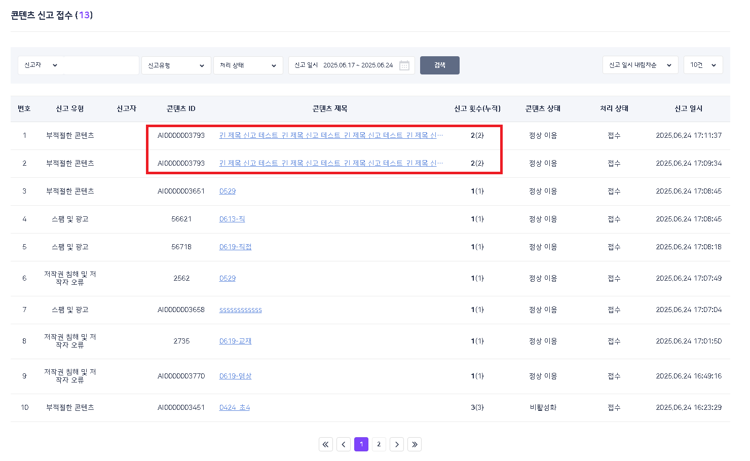 | Summary | 0001062: 플랫폼 BO - 콘텐츠 신고 접수 - 같은 콘텐츠 다른 계정으로 신고시 신고 내용이 중복으로 노출되는 현상 | ||||