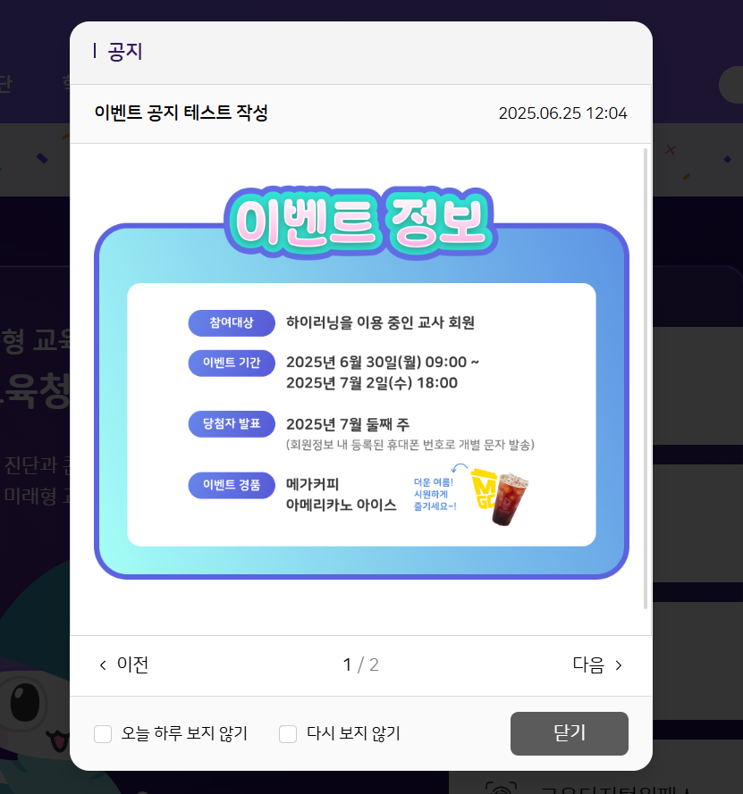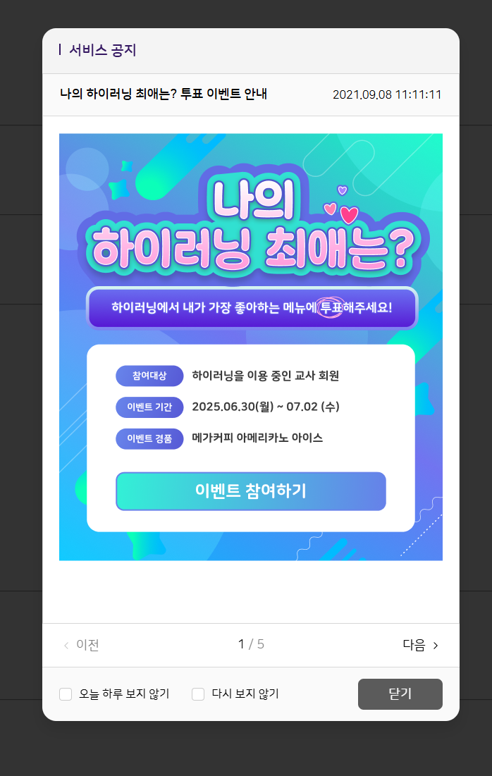 | Summary | 0001075: 하이러닝 이벤트 메인 팝업 이미지가 퍼블과 상이함 | ||||