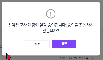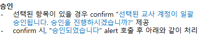 | Description | 학교BO - 승인 대기중인 계정 선택 후 [승인] 버튼 클릭 시 팝업 문구가 기획과 상이 기획 : "선택된 교사 계정이 일괄 승인됩니다. 승인을 진행하시겠습니까?" confirm 제공 TB : "해당 계정의 회원 가입 신청을 승인하시겠습니까?" confirm 제공 | ||||