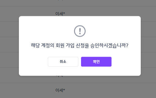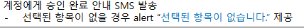 | Description | 학교BO - 승인 대기중인 계정 아무것도 선택하지 않은 후 [승인] 버튼 클릭 시 팝업 문구가 기획과 상이 기획 : "선택된 항목이 없습니다." alert 제공 TB : "해당 계정의 회원 가입 신청을 승인하시겠습니까?" confirm 제공 | ||||