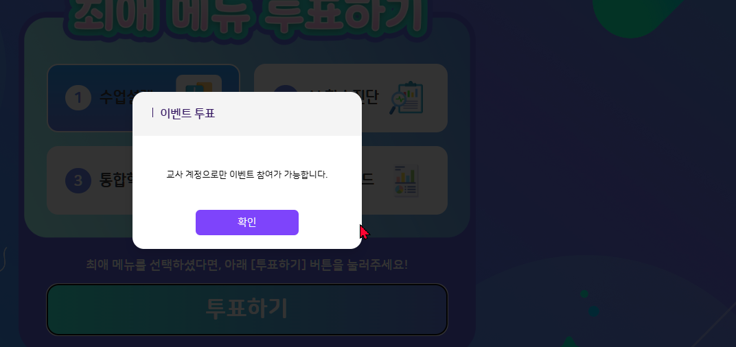| Description | 학생/학부모가 [투표하기] 버튼 클릭 시, 개인정보 수집 및 이용 동의 팝업 노출되는 현상 *기대결과 : 개인정보 수집 및 이용 동의 팝업이 아닌 "교사 계정으로만 이벤트 참여가 가능합니다." alert이 노출되어야 함 | ||||