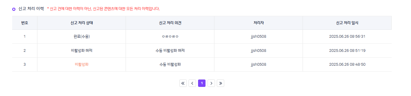 | Description | 비활성화/비활성화 해제 일 때, 신고 처리 의견이 기획과 다른 현상 기획 관리자가 수동으로 처리한 비활성화 : -(하이픈) 표기 비활성화 해제 : -(하이픈) 표기 TB 관리자가 수동으로 처리한 비활성화 : 수동 비활성화 비활성화 해제 : 수동 비활성화 해제 | ||||