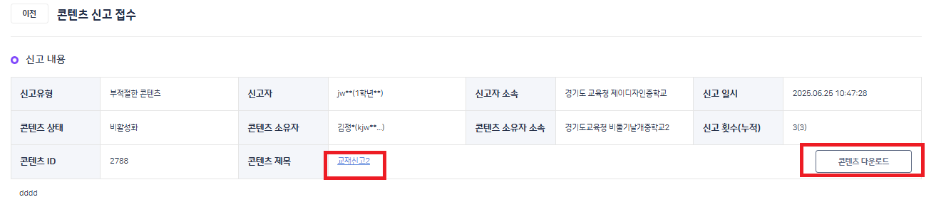 | 2025-06-26 03:18 | 이세희 | Summary | 신고된 영상/교재 상세 페이지에 [콘텐츠 뷰어 미리보기] 버튼이 아닌 [콘텐츠 다운로드] 버튼이 노출되는 현상 => 플랫폼BO - 신고된 영상/교재 상세 페이지에 [콘텐츠 뷰어 미리보기] 버튼이 아닌 [콘텐츠 다운로드] 버튼이 노출되는 현상 |