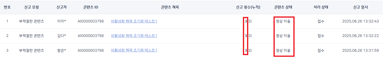 | related to | 0001100 | closed | 플랫폼 BO - 콘텐츠 신고 접수 - 비활성화 해제 시 신고 횟수 초기화 기획 문의. |