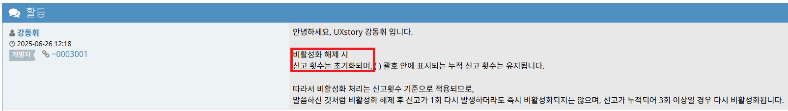 | Summary | 0001106: 비활성화가 해제되어 정상 이용이 가능한데 신고횟수는 0으로 초기화가 안되는 현상 | ||||
