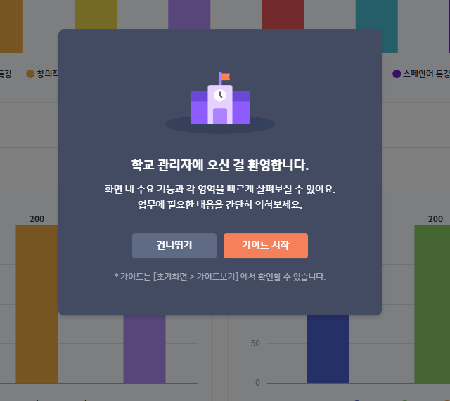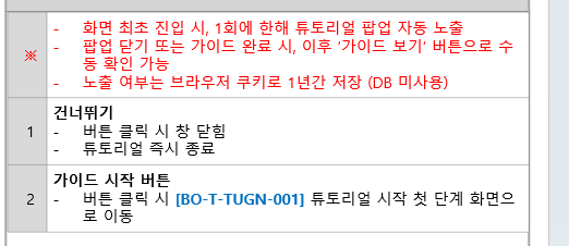 안녕하세요 Uxstory 박재연입니다. 튜토리얼 팝업은 ‘최초 진입 1회’에 한해 자동으로 노출되도록 정의하였으며, 건너뛰기 버튼으로 팝업 닫은 후, 재로그인 시에 대해서도 ‘팝업 닫기’ 또는 ‘가이드 완료’ 여부를 기준으로 수동 확인이 가능하다로 정의하였습니다. ‘건너뛰기’를 선택한 뒤 재로그인하는 경우는 최초 진입이 아니므로, 팝업은 다시 노출되지 않아야 합니다. (※ 단, 브라우저 쿠키가 삭제된 경우에는 팝업이 다시 노출됩니다.) 학교관리자 v.2.1.6 기준 20p에서 확인가능합니다. (설계서 이미지도 아래에 같이 첨부했습니다. |