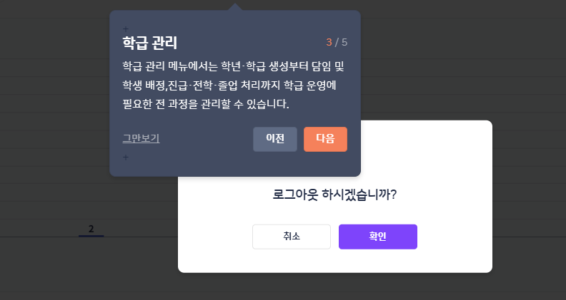 | Steps To Reproduce | 1. 학교BO 로그인 2. 튜도리얼 [가이드보기] > 튜토리얼 중간 단계 정도 진행 3. 로그아웃 4. 학교BO 재로그인 | ||||