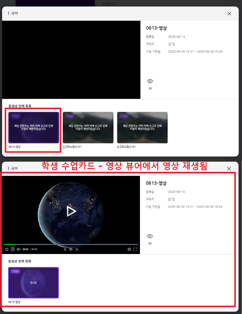 | Summary | 0001155: 학생 수업 카드에서 비활성화 된 영상이 재생되는 현상 | ||||