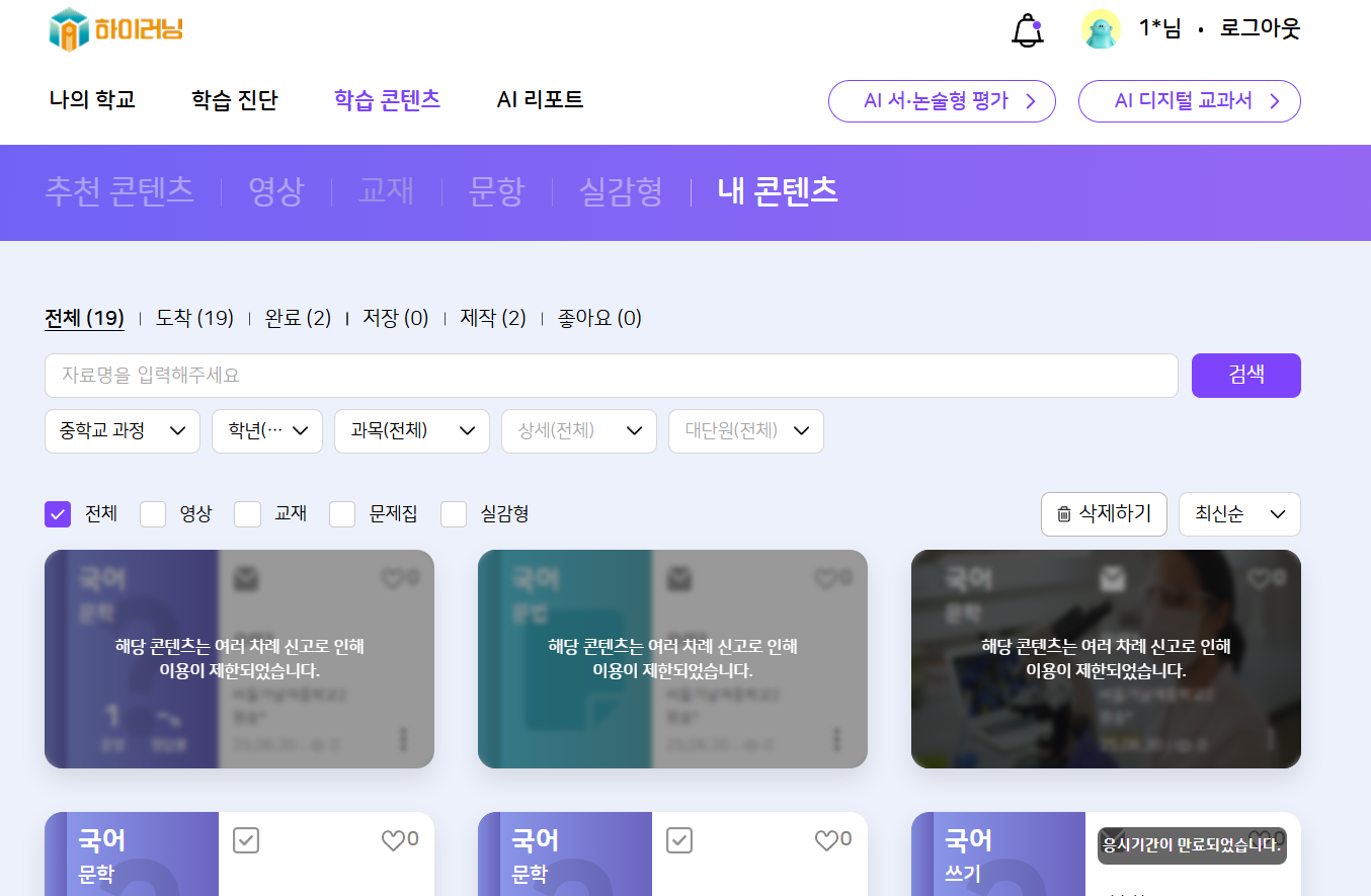 | Description | 학생 할 일 목록에서 비활성화 된 문제집 클릭 시, 내콘텐츠 메인으로 이동되는 현상 *기대결과 : "해당 콘텐츠는 여러 차례 신고로 인해 이용이 제한되었습니다." alert 노출 | ||||
