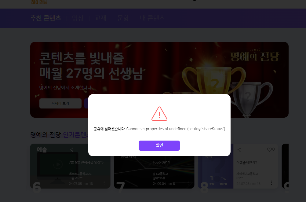 | Description | 명예의 전당 인기콘텐츠 공유 수정 시 오류 팝업 노출 ( 우리학교, 공유안함 문구 다름) | ||||