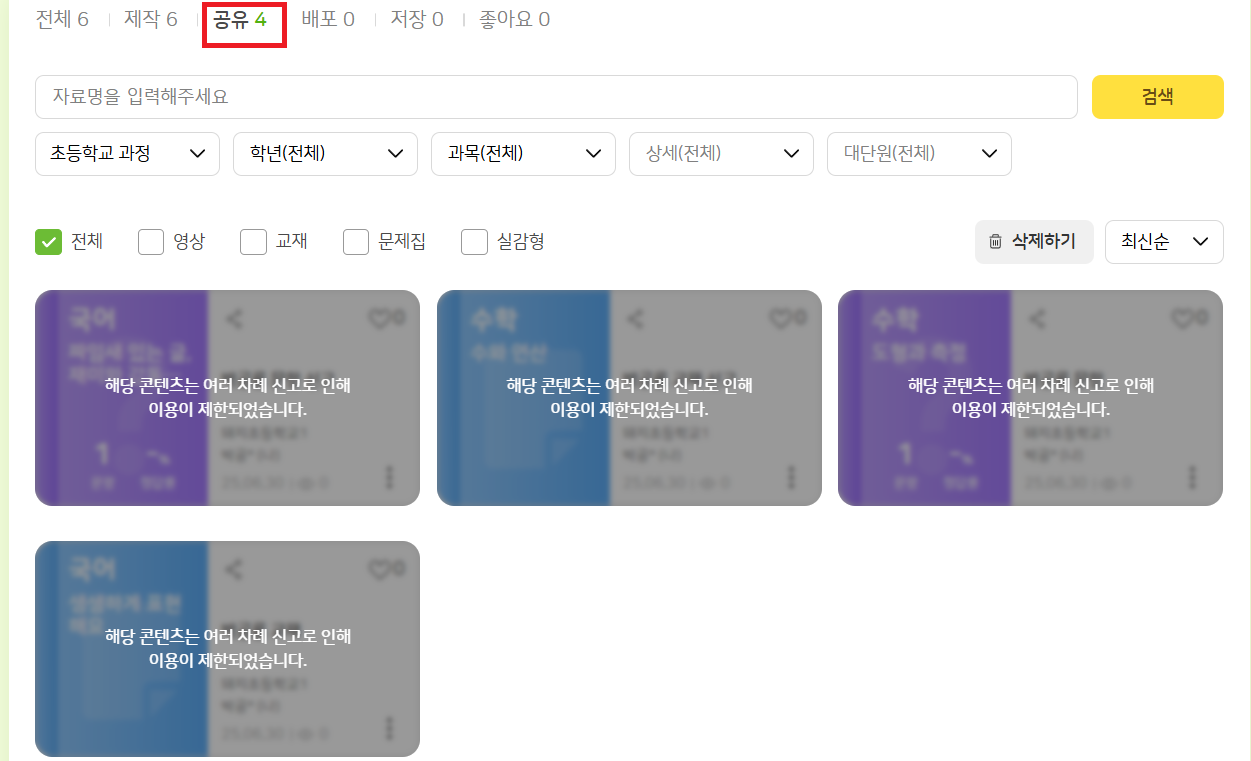 | Summary | 0001160: 전체학교 공유로 올린 영상이 비활성화 된 후 교사가 전출되었을 때, 전출된 교사의 내콘텐츠 > 공유에 노출이 안되는 현상 | ||||