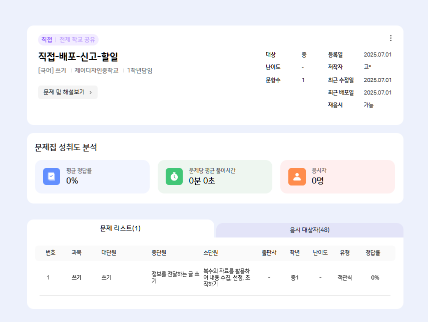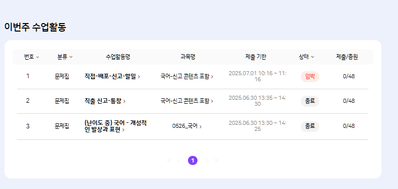 | 2025-07-01 03:48 | 이세희 | Summary | 교사 나의 교실 > 이번주 수업 활동에서 비활성화 된 문제집이 진입되는 현상 => 교사 : 나의 교실 > 이번주 수업 활동에서 비활성화 된 문제집이 진입되는 현상 |