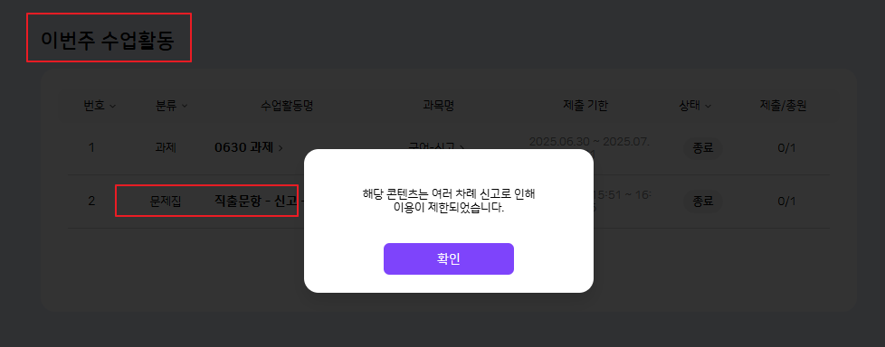 | Description | 교사 : 나의 교실 > 이번주 수업 활동에서 비활성화 된 문제집이 진입되는 현상 *기대결과 : "해당 콘텐츠는 여러 차례 신고로 인해 이용이 제한되었습니다." alert 노출 | ||||
