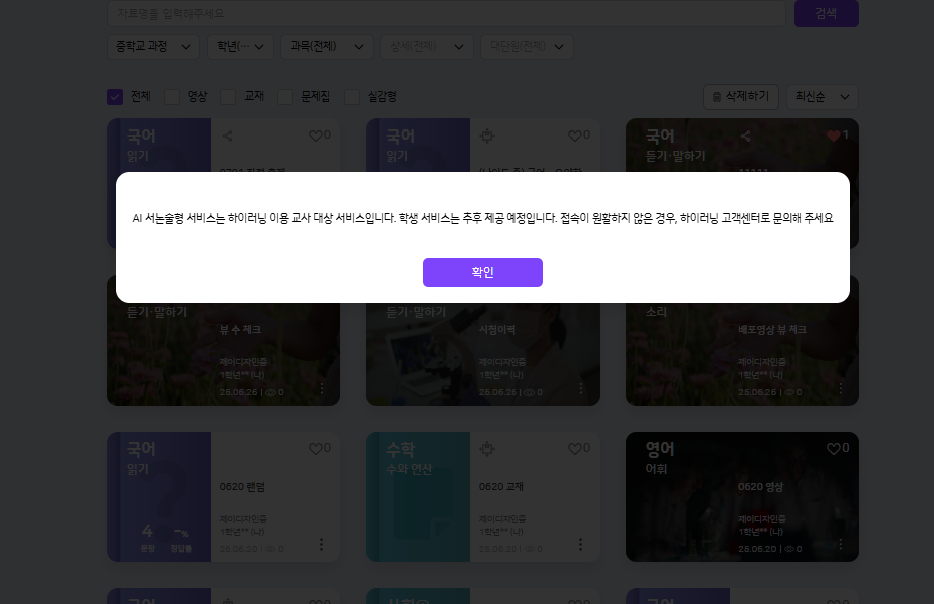 | Steps To Reproduce | 1. jw01 계정 로그인 (학년도 전환 계정) 2. AI 서 논술형 평가 버튼 클릭 | ||||