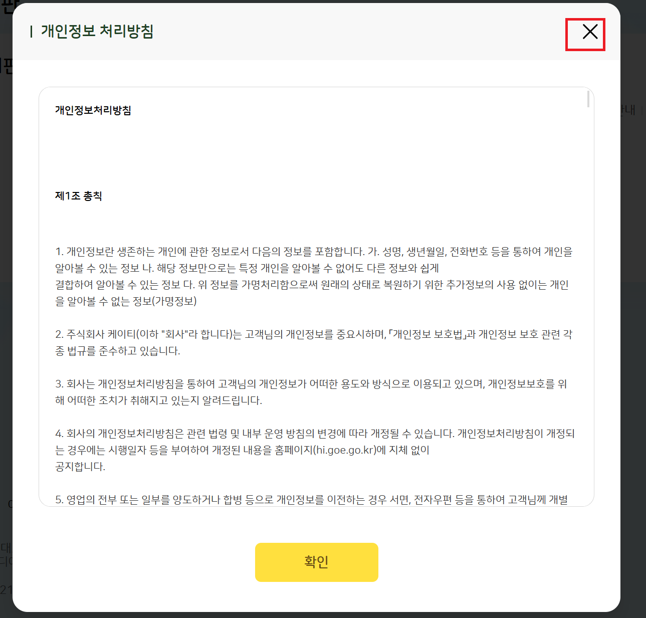| Description | 하이러닝 개인정보 처리방침 팝업의 [X] 버튼 반응 없는 현상 *기대결과 : [X] 버튼 눌러도 닫혀야 함 | ||||