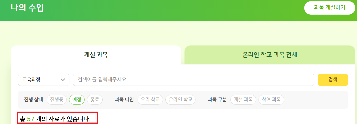 | Description | 나의 수업에서 과목 필터를 바꾸어도 자료 개수가 같은 현상 *기대결과 : 진행 상태, 과목 타입, 과목 구분에 따라 자료 개수가 달라야 함 ex) 총 57개의 자료가 있습니다. | ||||