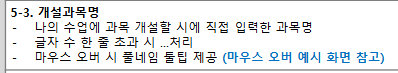 | Summary | 0001202: 수업 설계안 가져오기 시, 수업카드 내 개설과목명에 호버해도 풀네임 툴팁 미노출되는 현상 | ||||