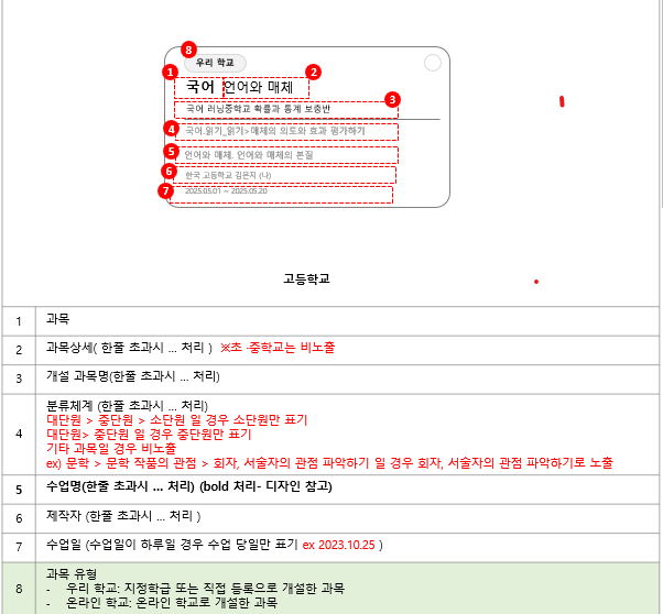 @강동휘 기획자님 댓글로 올려주신 이슈 확인했습니다 해당 이슈는 온라인 학교 과목만의 이슈가 아니라 일반(온라인 학교가 아닌) 과목에서도 발생하는 오류이며 개설과목명과 과목요약 둘 다 작성 시, 수업카드에 과목요약이 반영되는 이슈입니다(과목요약을 애초에 작성 안했을 때는 개설과목명이 반영됨) 댓글로 올려주신 이슈는 새로운 이슈로 올리겠습니다 감사합니다 |