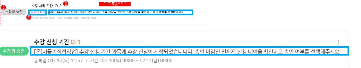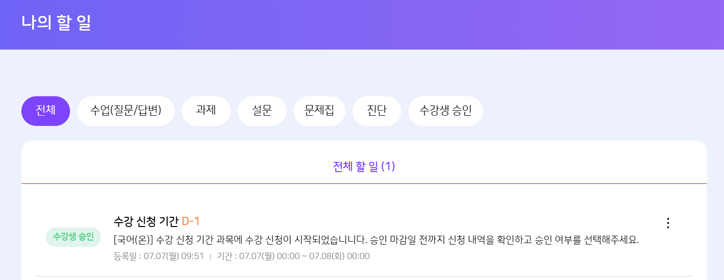 해당 이슈 학생의 수강 신청과 관계없이 '직접 승인' 과목의 수강 신청 기간이 시작되는 경우에 노출되는 것으로 알고 있습니다. 현재 TB 기준 교사 계정 > 직접 승인 과목 개설 > 할일 상세에 잘 노출 됩니다만(아래 첨부 이미지) 혹시 어떤 상황이었는지 자세히 알 수 있을까요? + 문구 및 D-day 오류는 확인하여 수정 진행하겠습니다. |