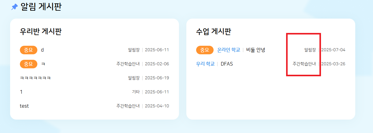 | Description | 교사/학생 메인 하단 수업 게시판에 과목 또는 상세 과목이 아닌 게시물 종류가 노출되는 현상 *기대결과 : 게시물 종류(알림장, 주간학습안내 등)이 아닌 과목 또는 상세 과목(국어, 수학, 독서 등)이 노출되어야 함 | ||||