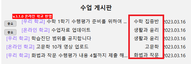 | Summary | 0001207: 교사/학생 메인 하단 수업 게시판에 과목 또는 상세 과목이 아닌 게시물 종류가 노출되는 현상 | ||||