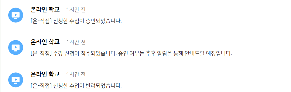 | Description | 승인 기획 : [과목] + 수강 신청이 승인되었습니다. TB : [과목] + 신청한 수업이 승인되었습니다. 반려 기획 : [과목] + 수강 신청이 반려되었습니다. TB : [과목] + 신청한 수업이 반려되었습니다. | ||||