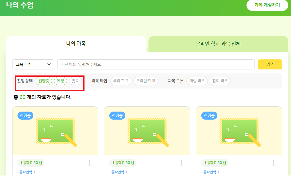 | Summary | 0001215: 나의 과목의 과목 필터가 진행중, 예정으로 선택되어 있는 현상 | ||||
